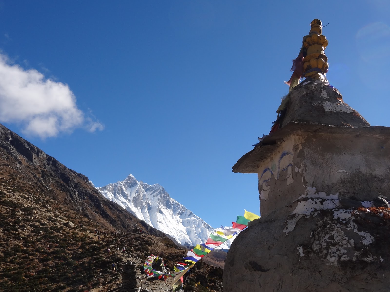 What was also funny was that it wasn't until we were about to head to Everest Base Camp when we saw a sliver of Mt. Everest itself. Then actually AT Everest Base Camp you don't see Mt. Everest at all and it is not anything different than anything we saw before. BUT not disappointing because... that is what you expect! It REALLY is about the journey to get there. So here are the actual views of when we made it to Everest Base Camp and our shots of Everest when we did see it: